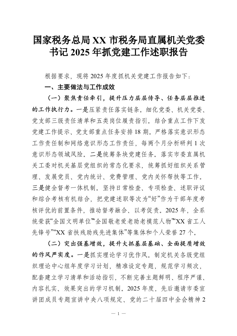 国家税务总局XX市税务局直属机关党委书记2025年抓党建工作述职报告
