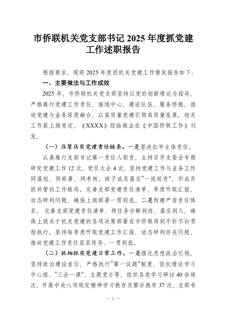 市侨联机关党支部书记2025年度抓党建工作述职报告