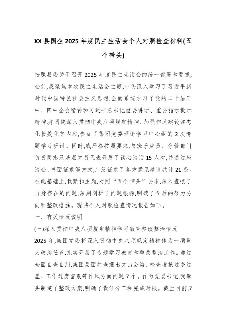 XX县国企2025年度民主生活会个人对照检查材料(五个带头)