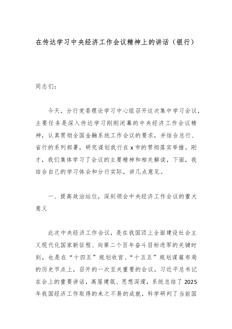 首页讲课讲稿在传达学习中央经济工作会议精神上的讲话(银行)
