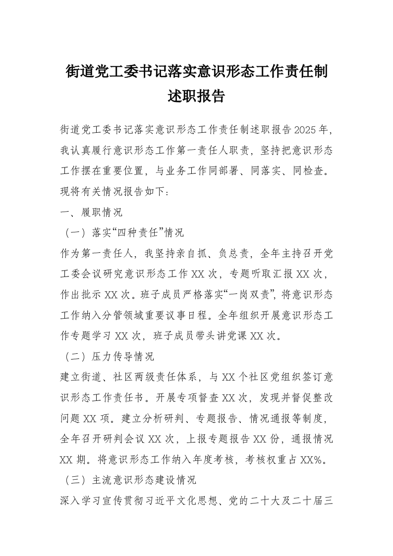 首页写作素材街道党工委书记落实意识形态工作责任制述职报告