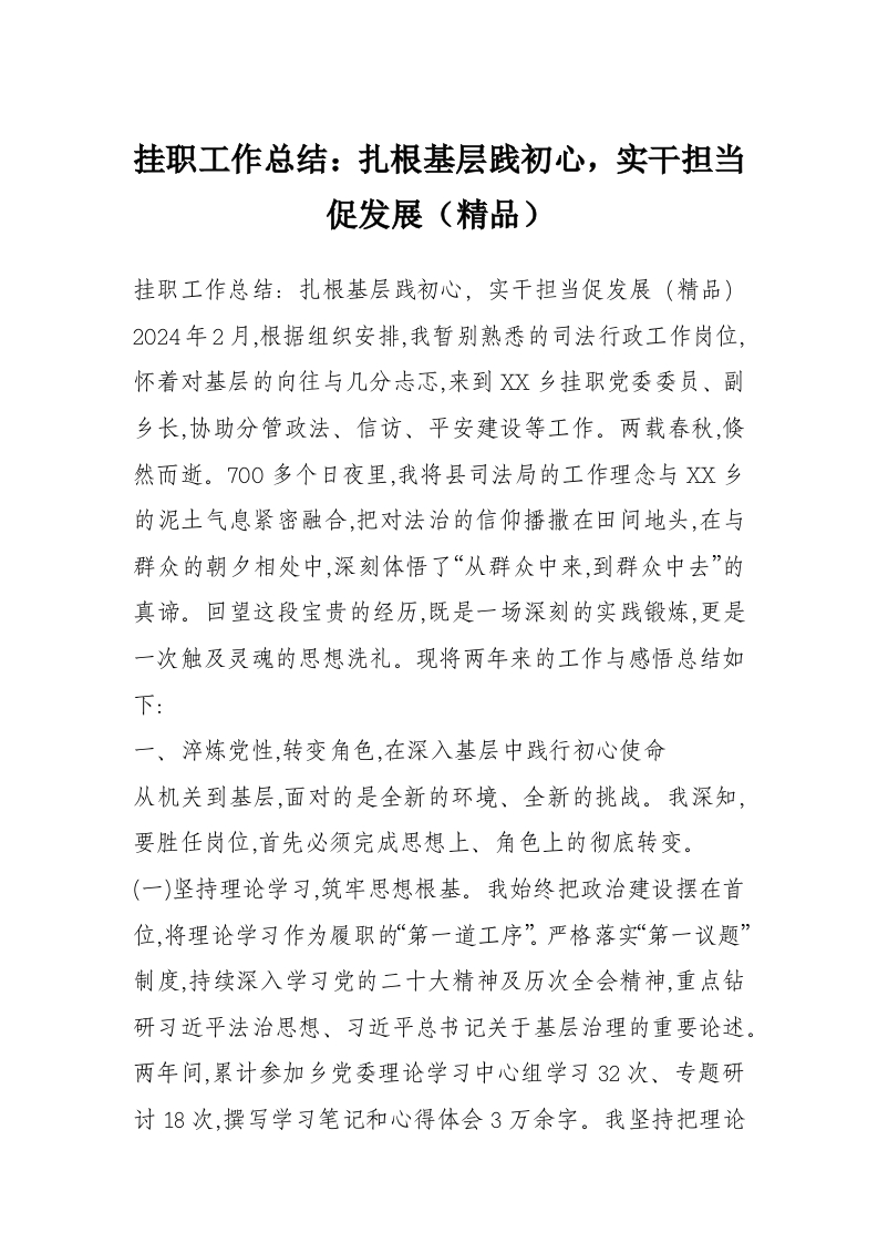 挂职工作总结:扎根基层践初心,实干担当促发展(精品)
