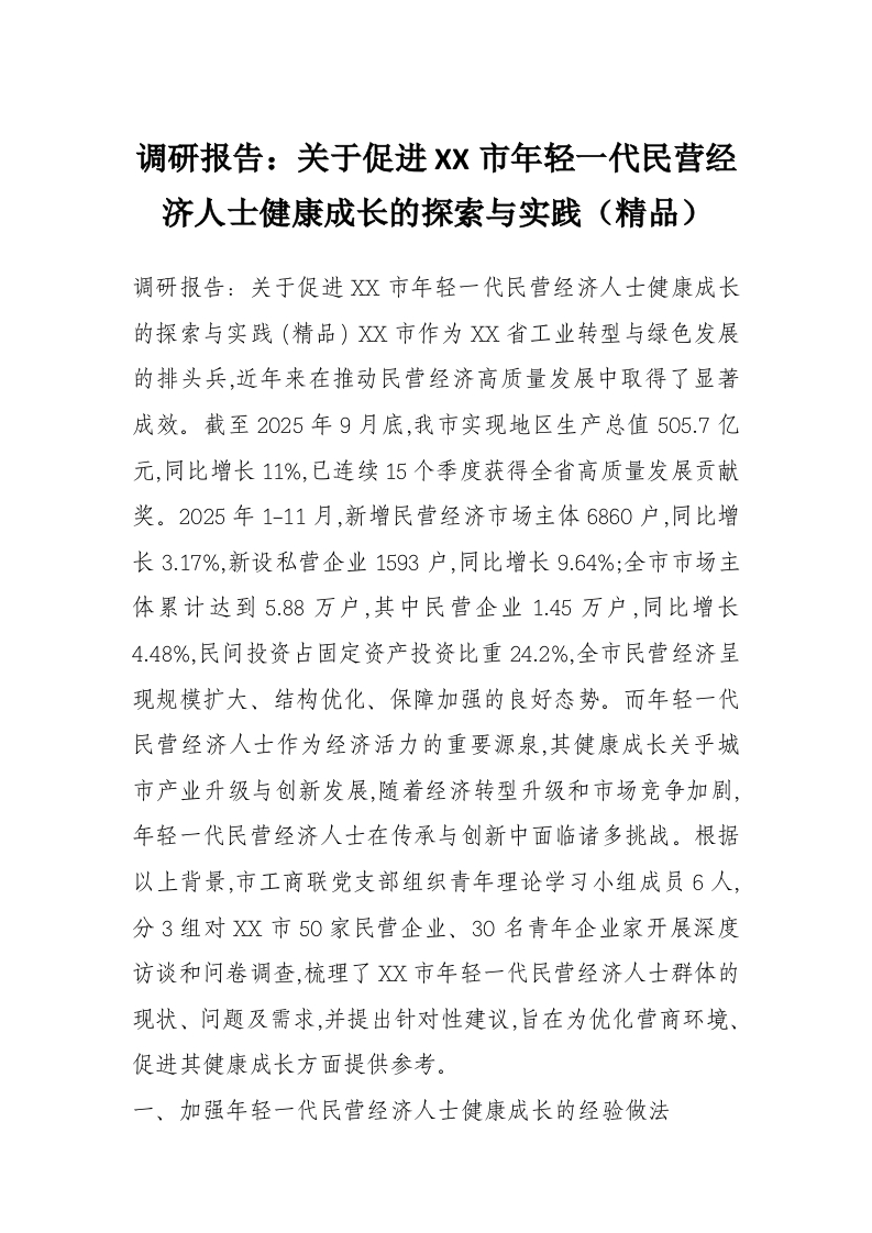 首页材料汇编调研报告:关于促进XX市年轻一代民营经济人士健康成长的探索与实践(精品)