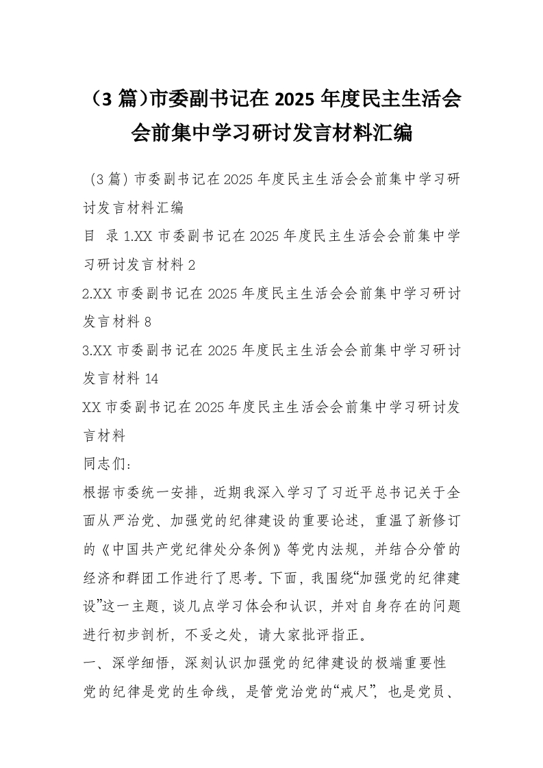 (3篇)市委副书记在2025年度民主生活会会前集中学习研讨发言材料汇编