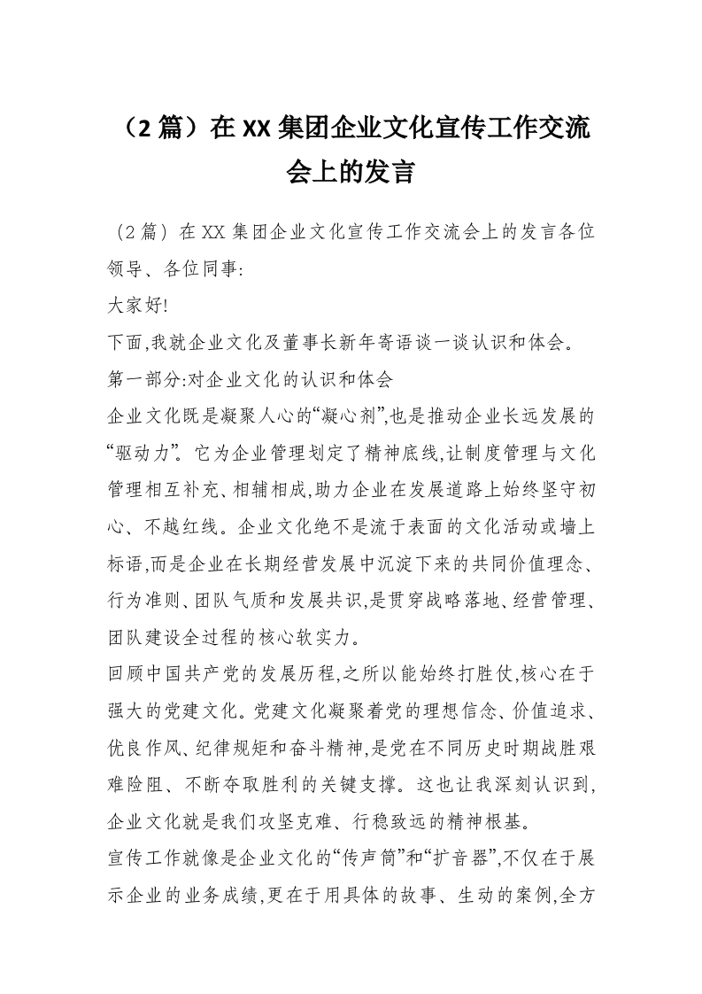 (2篇)在XX集团企业文化宣传工作交流会上的发言