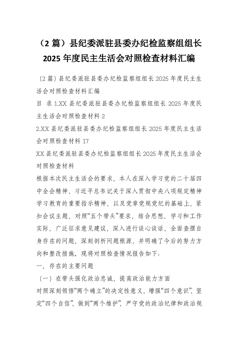 (2篇)县纪委派驻县委办纪检监察组组长2025年度民主生活会对照检查材料汇编