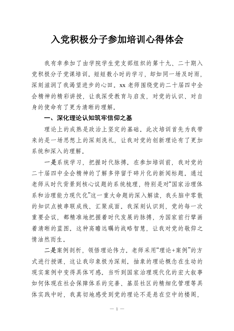 入党积极分子参加培训心得体会