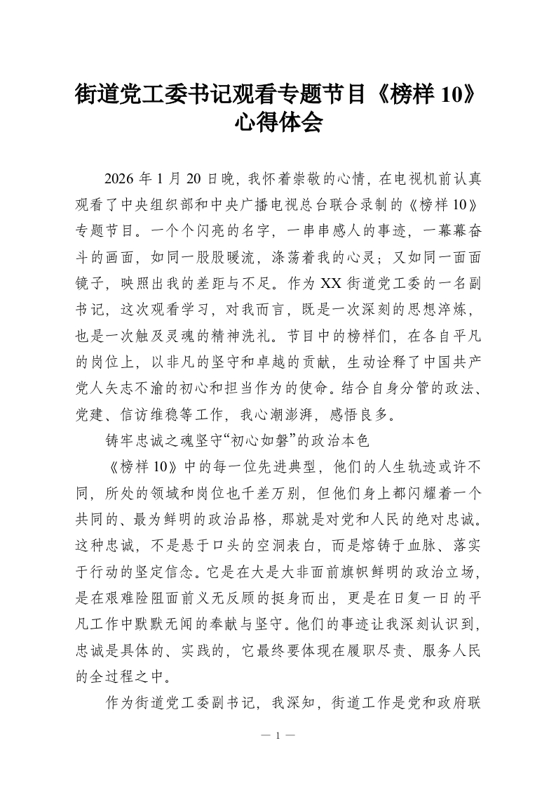 街道党工委书记观看专题节目《榜样10》心得体会