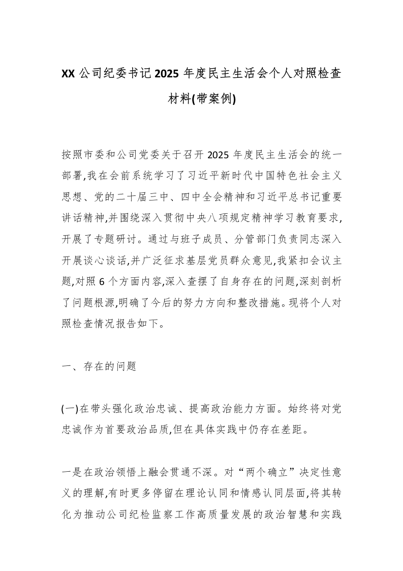 首页讲课讲稿XX公司纪委书记2025年度民主生活会个人对照检查材料(带案例)