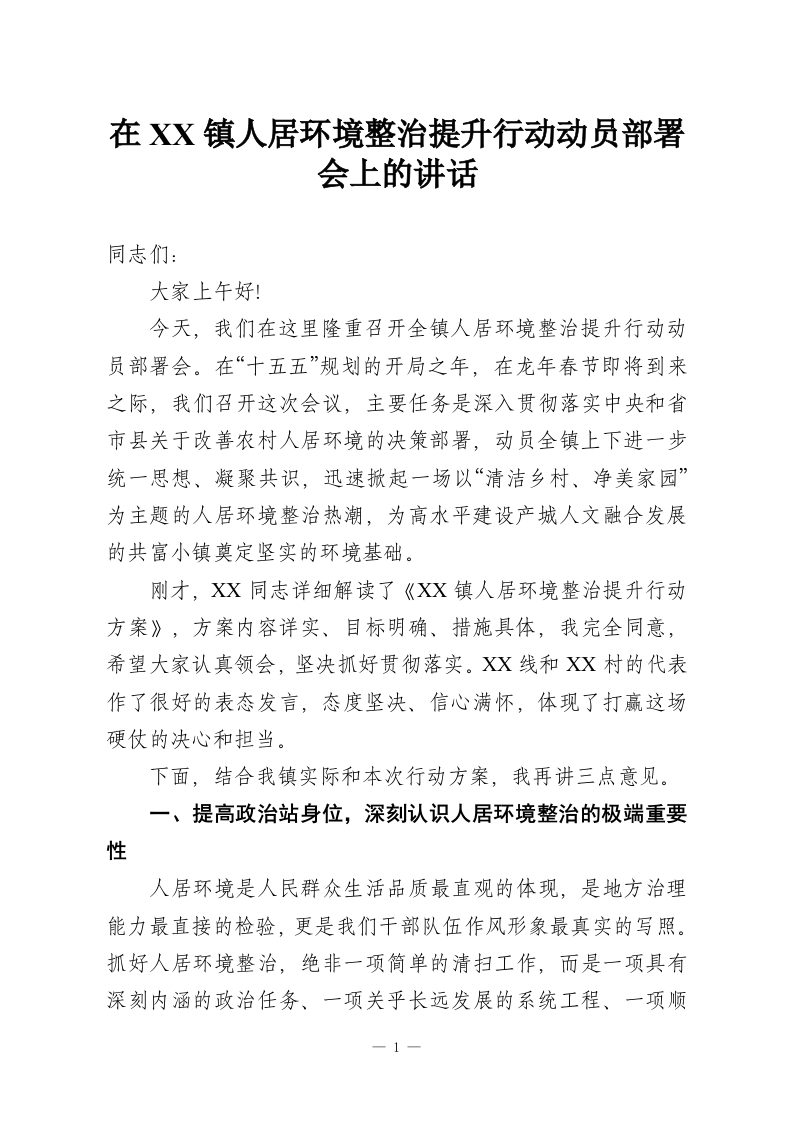 在XX镇人居环境整治提升行动动员部署会上的讲话