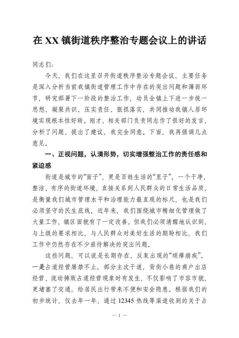 在XX镇街道秩序整治专题会议上的讲话