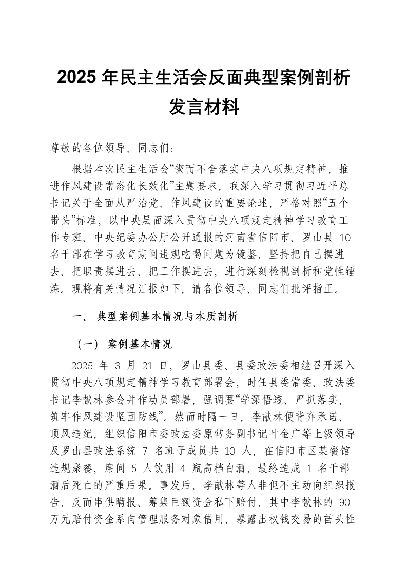 2025年民主生活会反面典型案例剖析发言材料