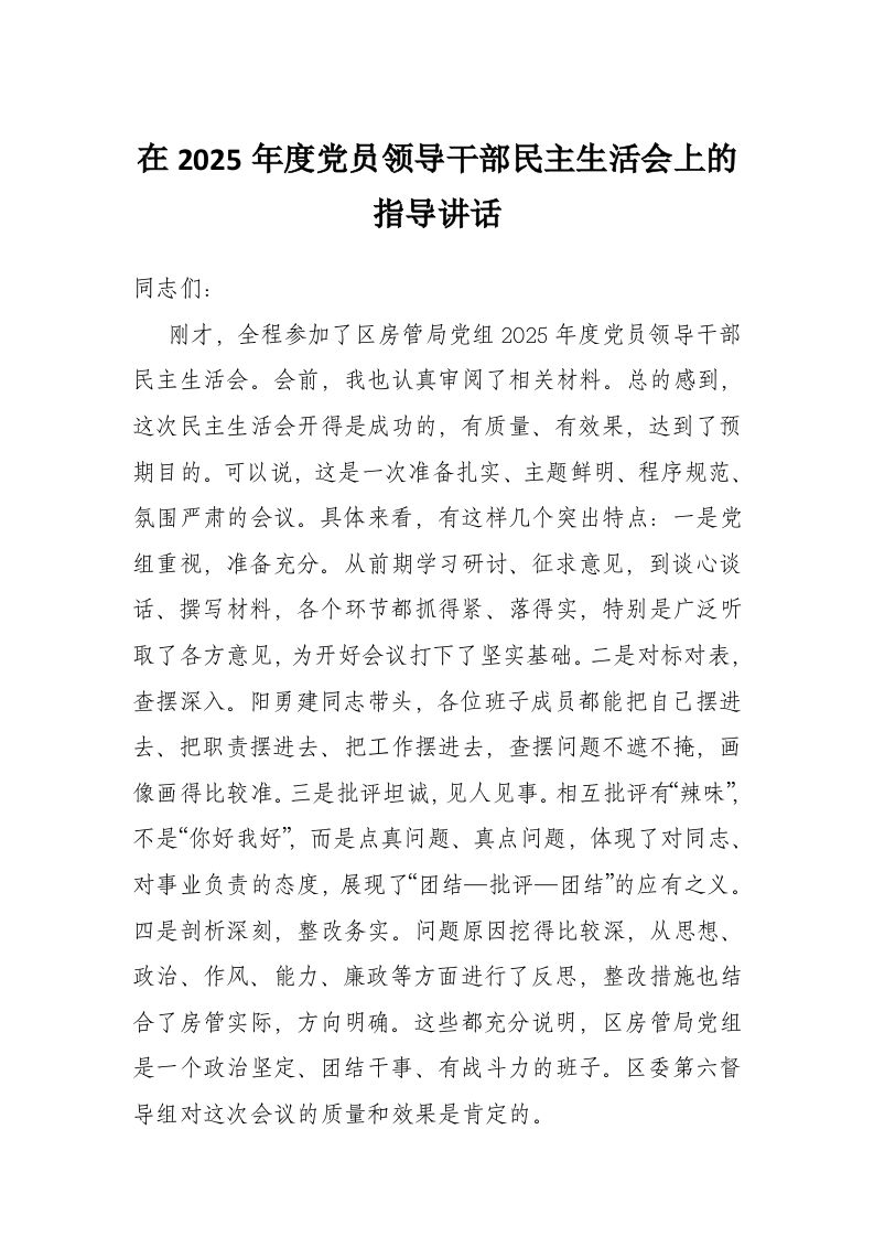 首页工作文档在2025年度党员领导干部民主生活会上的指导讲话