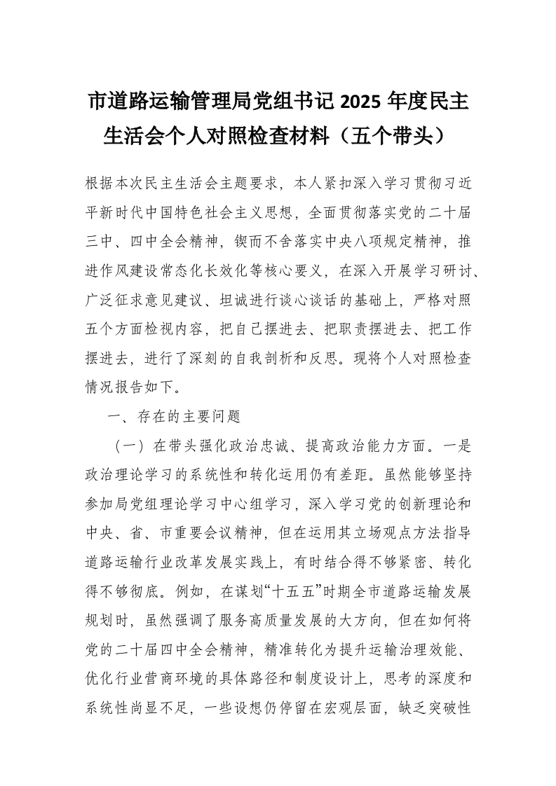 市道路运输管理局党组书记2025年度民主生活会个人对照检查材料(五个带头)
