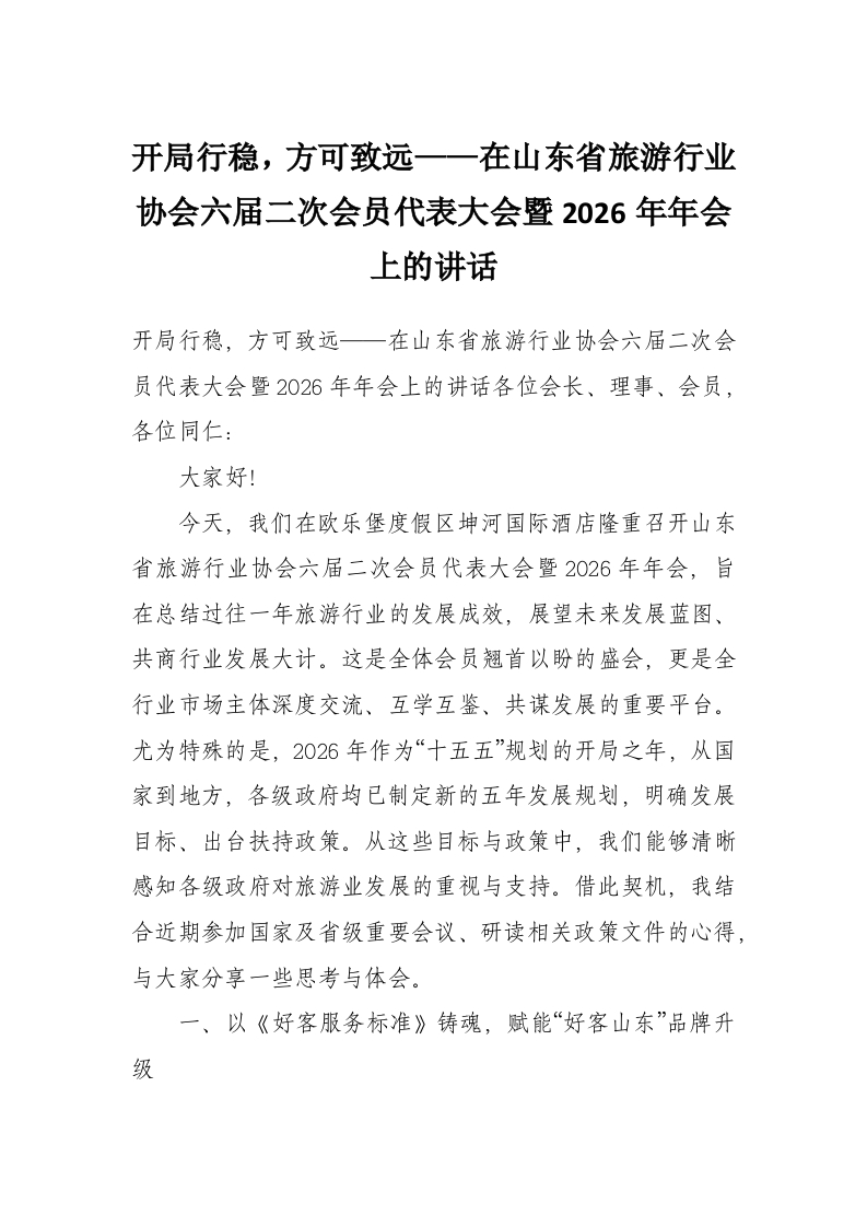 首页工作文档开局行稳,方可致远——在山东省旅游行业协会六届二次会员代表大会暨2026年年会上的讲话
