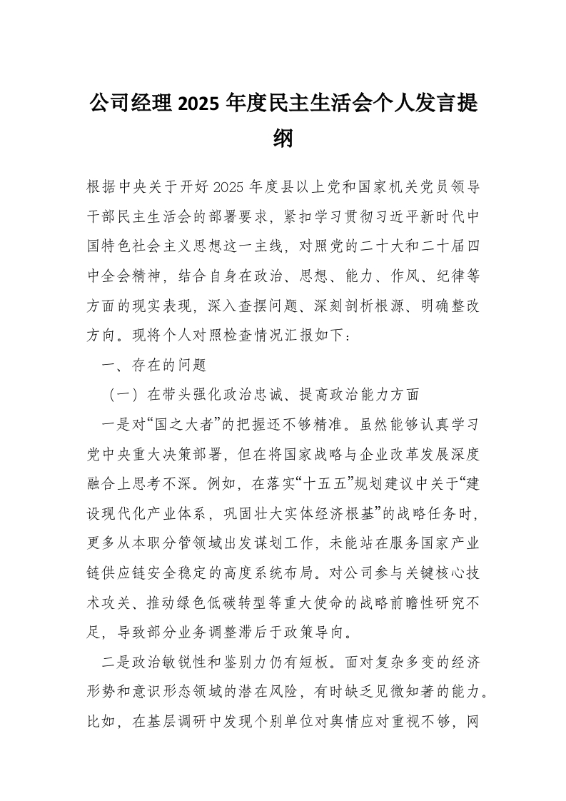 首页工作文档公司经理2025年度民主生活会个人发言提纲