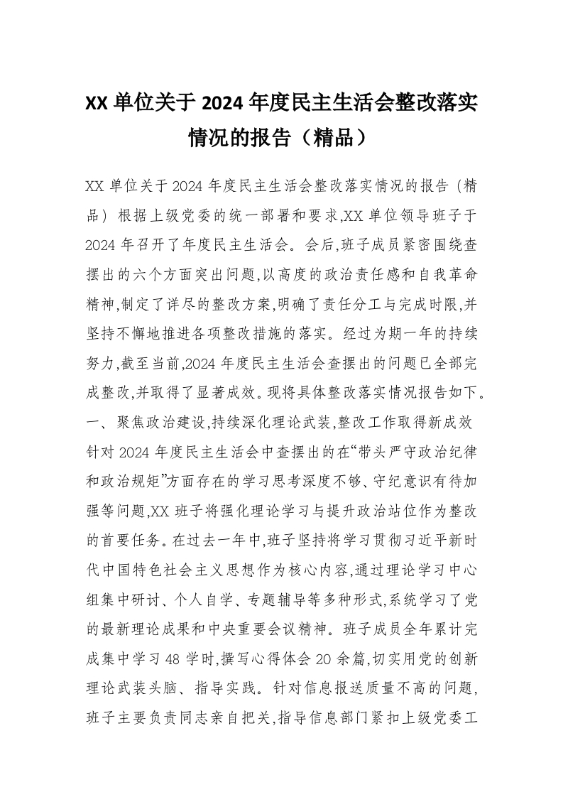 XX单位关于2024年度民主生活会整改落实情况的报告(精品)
