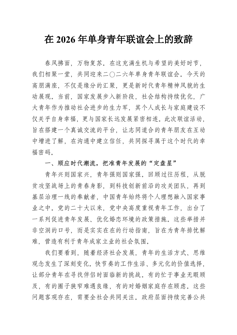 在2026年单身青年联谊会上的致辞