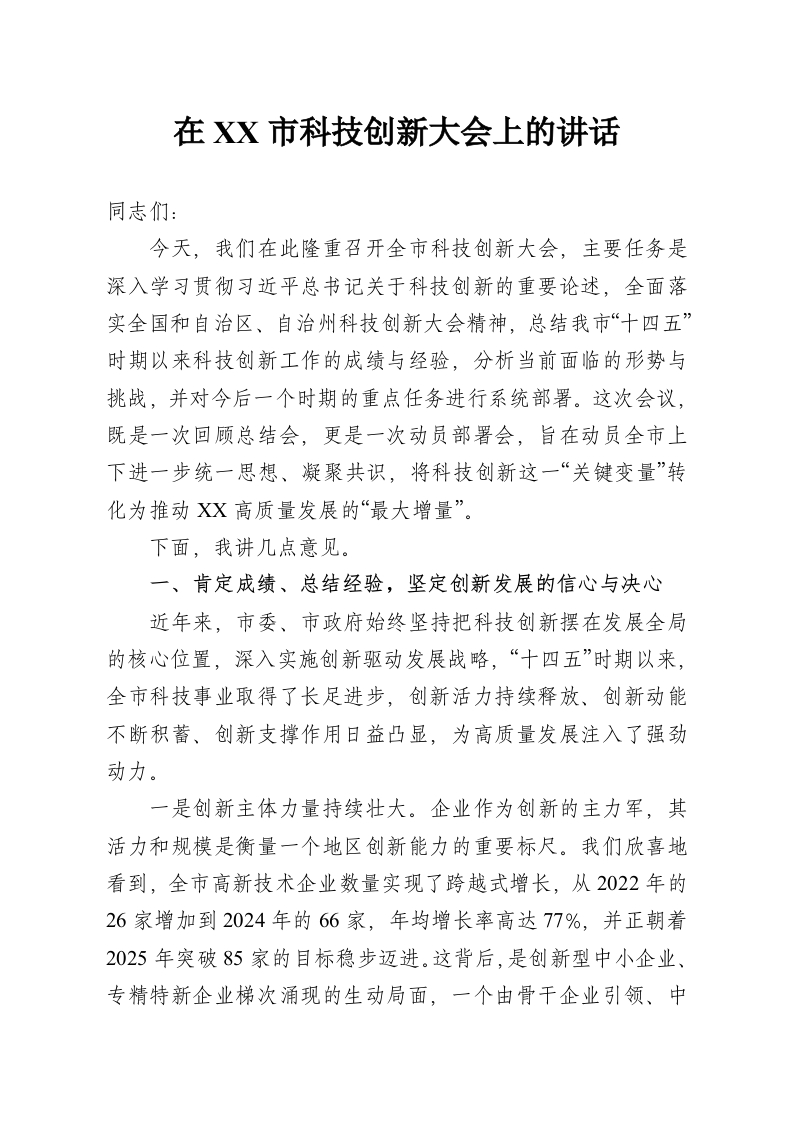 在XX市科技创新大会上的讲话