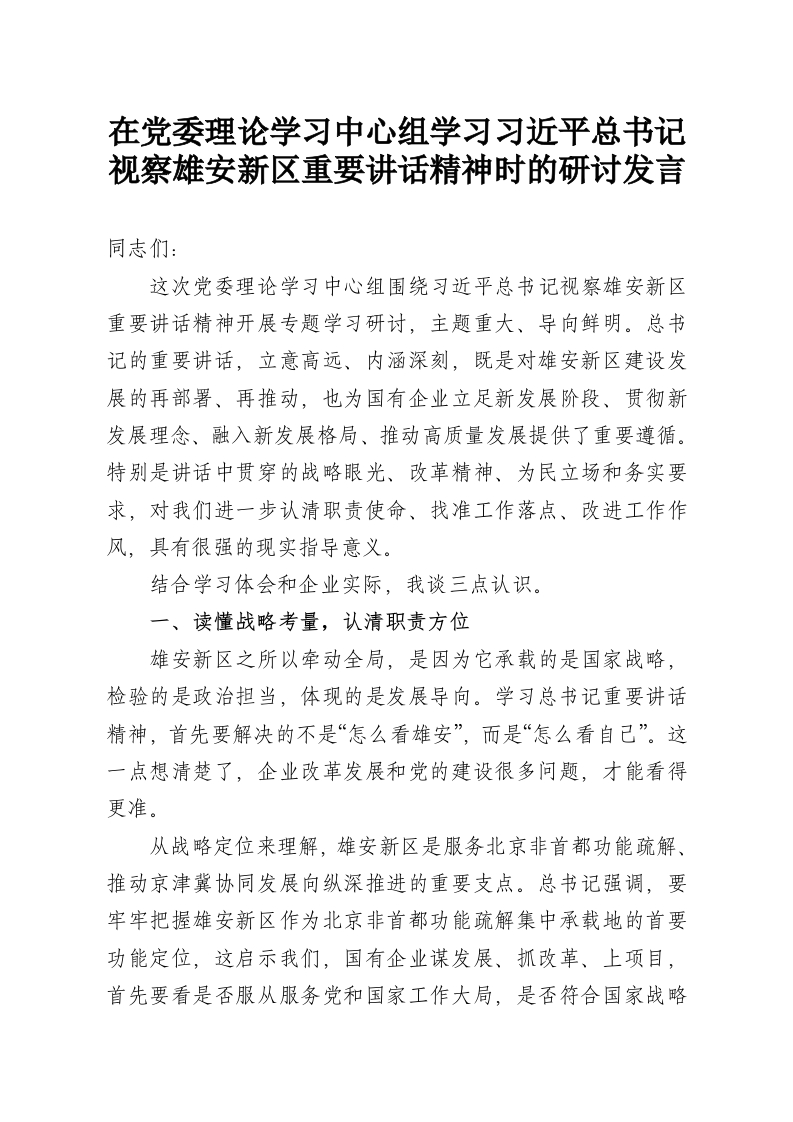 在党委理论学习中心组学习***总书记视察雄安新区重要讲话精神时的研讨发言