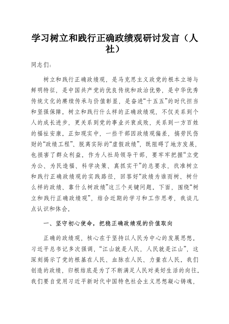 学习树立和践行正确政绩观研讨发言(人社)