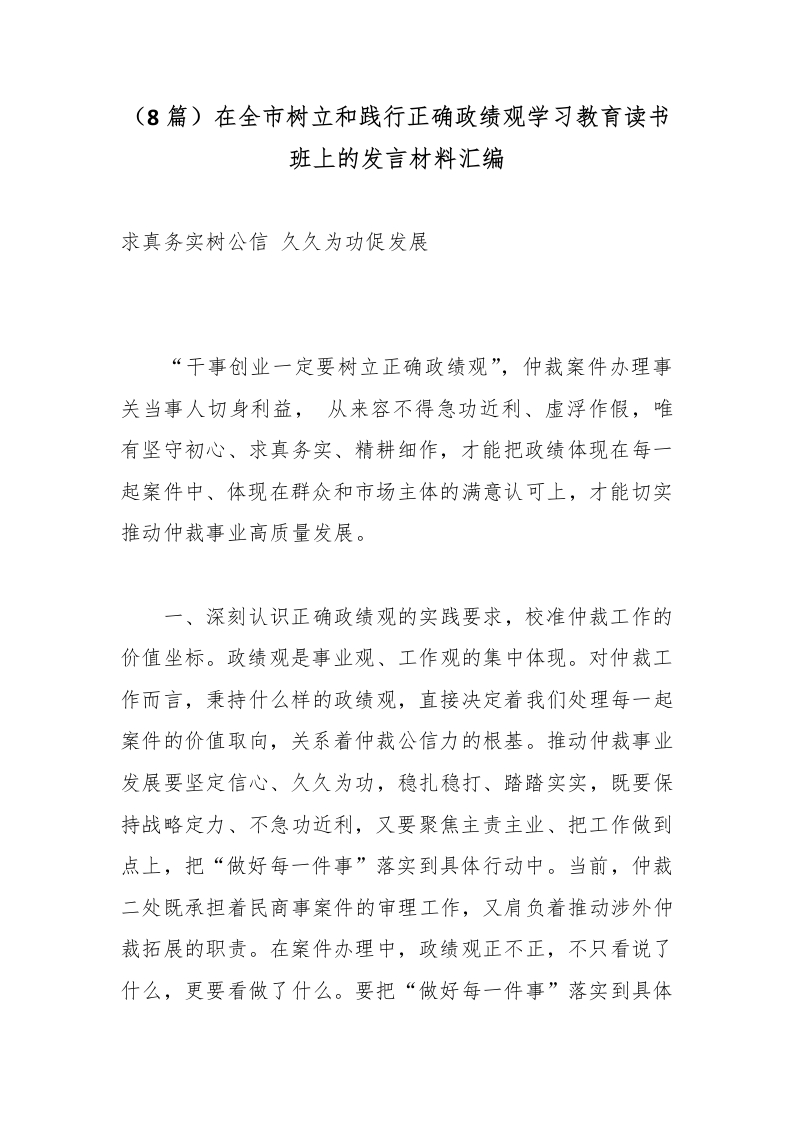 - (8篇)在全市树立和践行正确政绩观学习教育读书班上的发言材料汇编