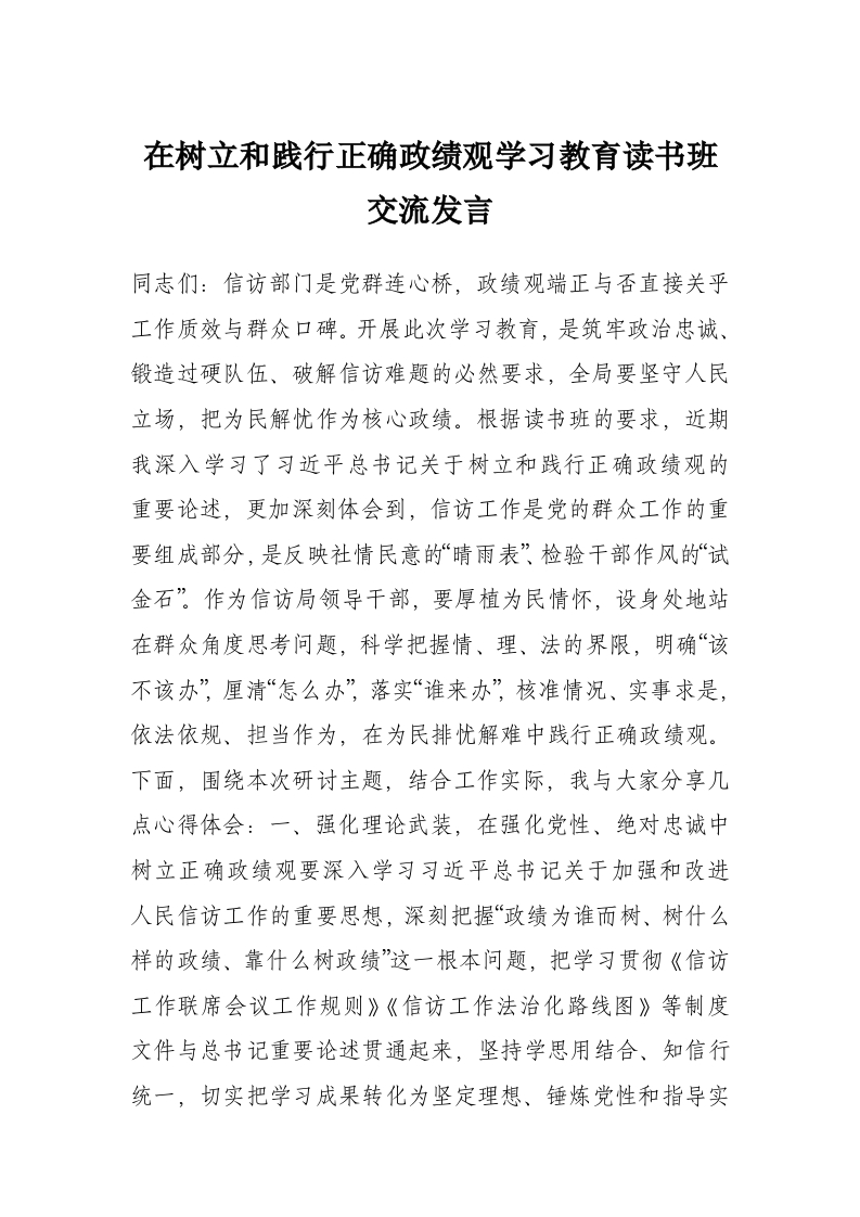 在树立和践行正确政绩观学习教育读书班交流发言